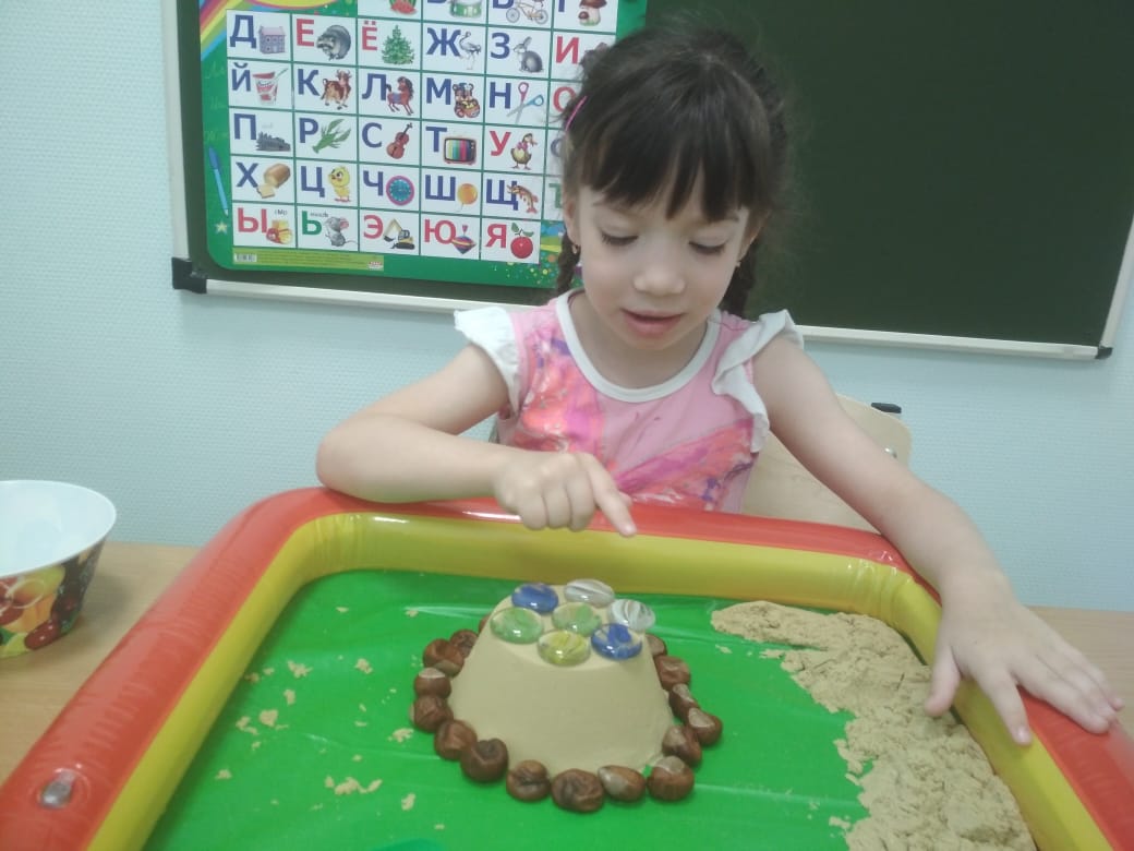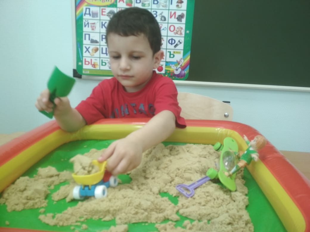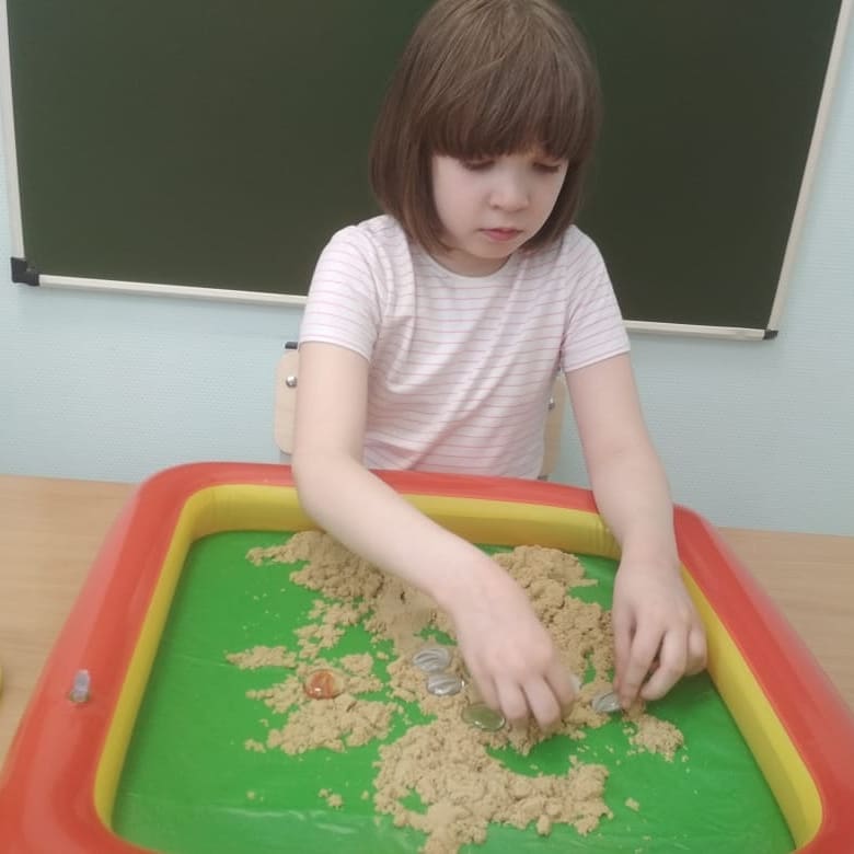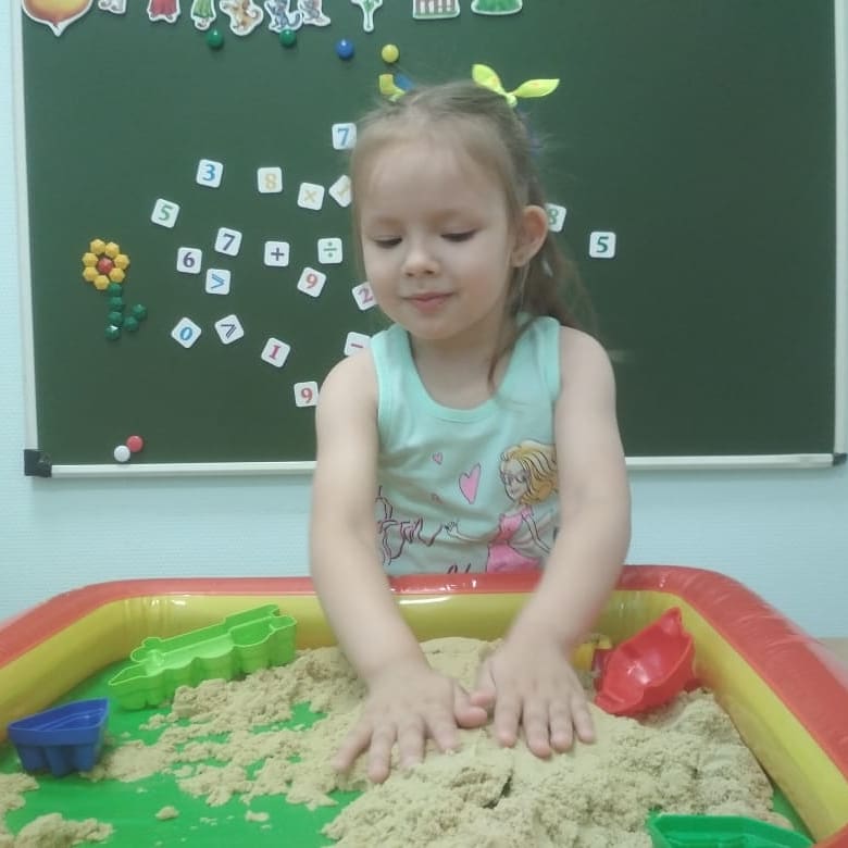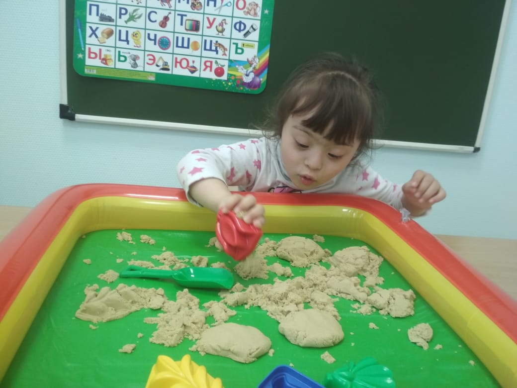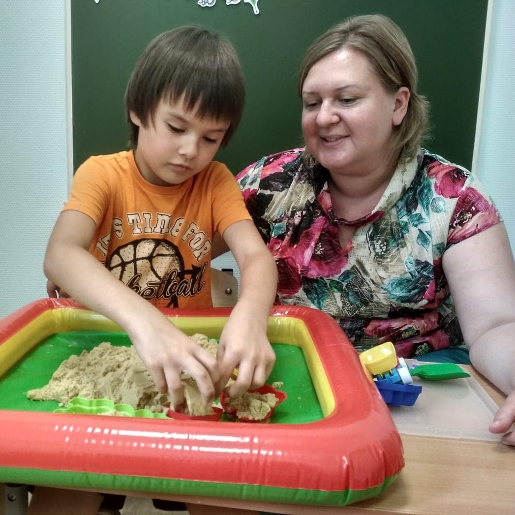 Дефектолог отделения реабилитации для детей с ОВЗ использует на занятии кинетический песок. Игры с кинетическим песком развивают мелкую моторику рук, тактильную чувствительность, творческое воображение, мышление, оказывают успокаивающий и расслабляющий эффект, дарят новые ощущения и эмоции