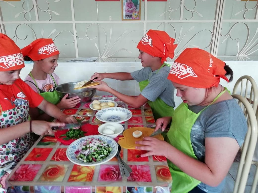 На занятии по домоводству, дети знакомились с русскими национальным традициями и учились готовить холодный суп «Окрошка».